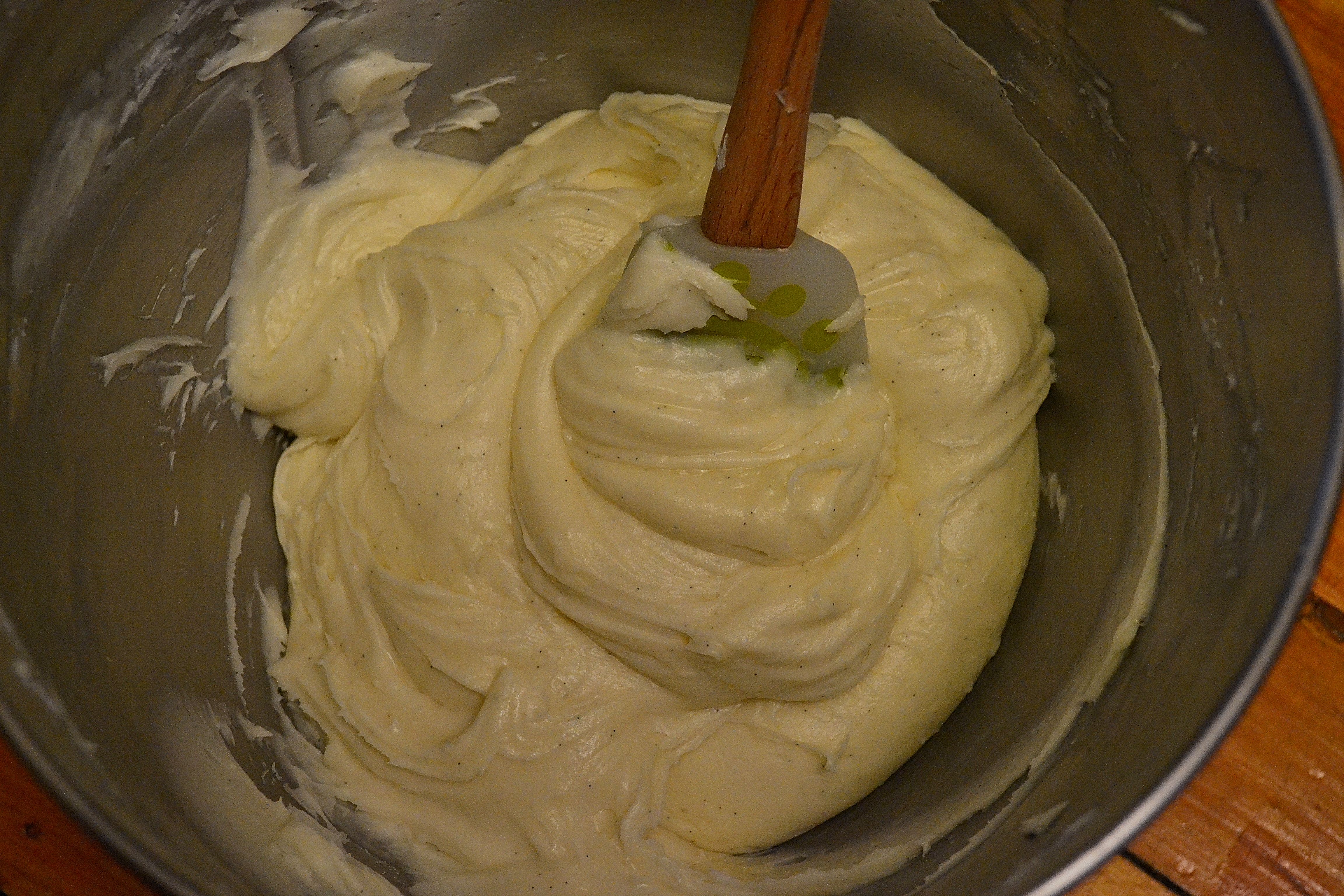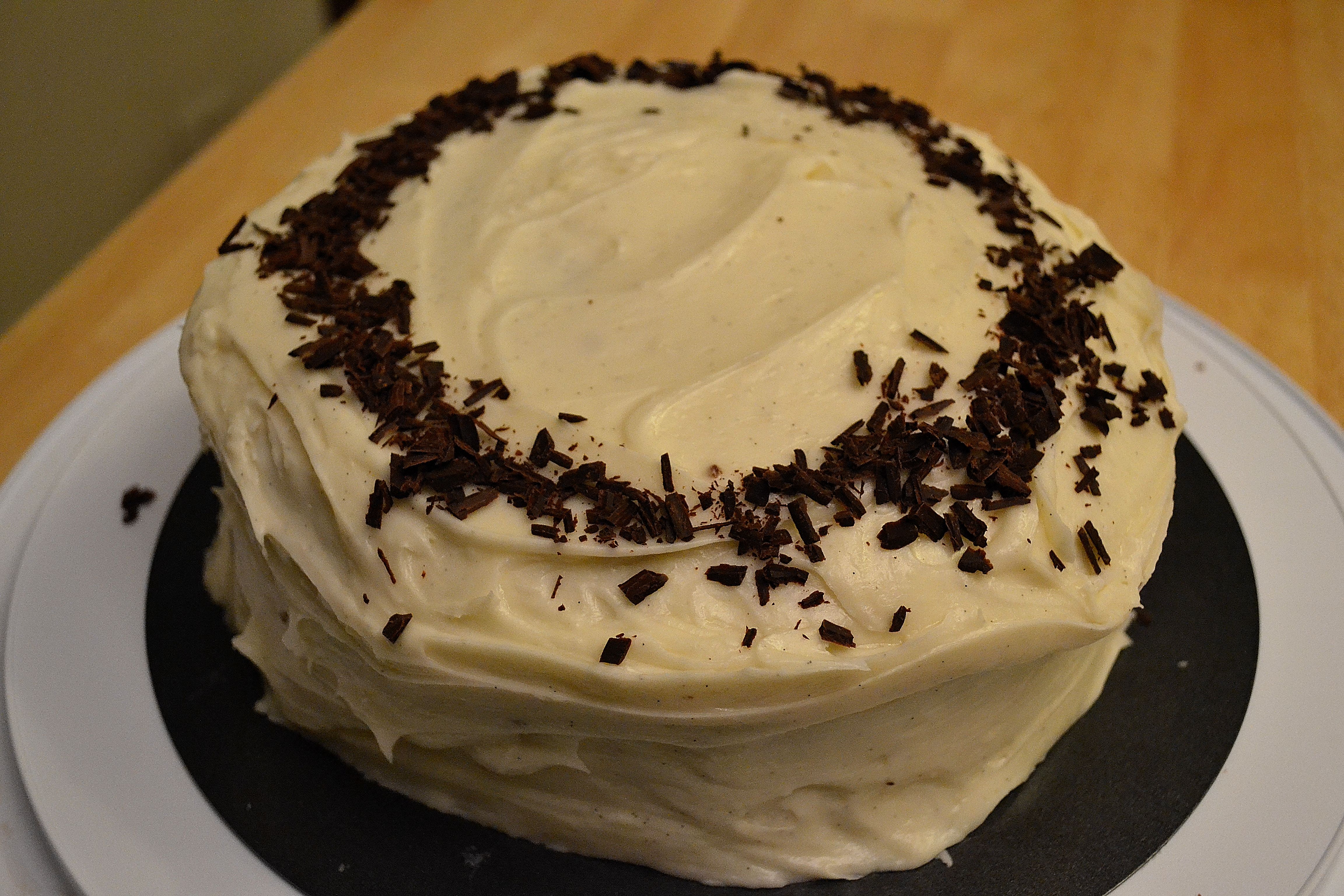This recipe had been on my radar for some time now – the original calls for a Peanut Butter Cream Cheese Frosting with a Chocolate Ganache topping. While that looks fantastic, I was more interested in the cake itself. Additionally, while I baked all three layers, I only used two in the final assembly considering there would only be 8 guests total (the unused cake layer I topped with frosting and stored in the fridge for later). As you can tell from my post not long ago, vanilla bean has become a new obsession of mine. While I admire the convenience and affordability of extract, nothing beats the intensity and beautiful aesthetic of vanilla seeds. I adapted the cream cheese frosting from the original recipe to make this vanilla frosting. I added some lemon juice to counterbalance the sweetness of the cake. You can find out how to make this decadent dessert by clicking HERE.