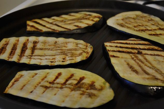 Though these seem complicated, they are actually quite simple. The most involved step is preparing the eggplant slices themselves. Eggplant is a water-laden vegetable, making it act more like a sponge than a vegetable when cooked. That’s why it’s crucial to salt these slices before grilling – you can skip this step, but you won’t get the same result. I stacked three cookie racks and arranged the slices across each layer. The salt acts as a dehydrator, and literally pulls the water out of the eggplant (you’ll see little beads of water towards the end of each 30-minute “session”). It also helps to take away a lot of the bitter taste often associated with the vegetable. The texture of these rolls was perfect as a result!