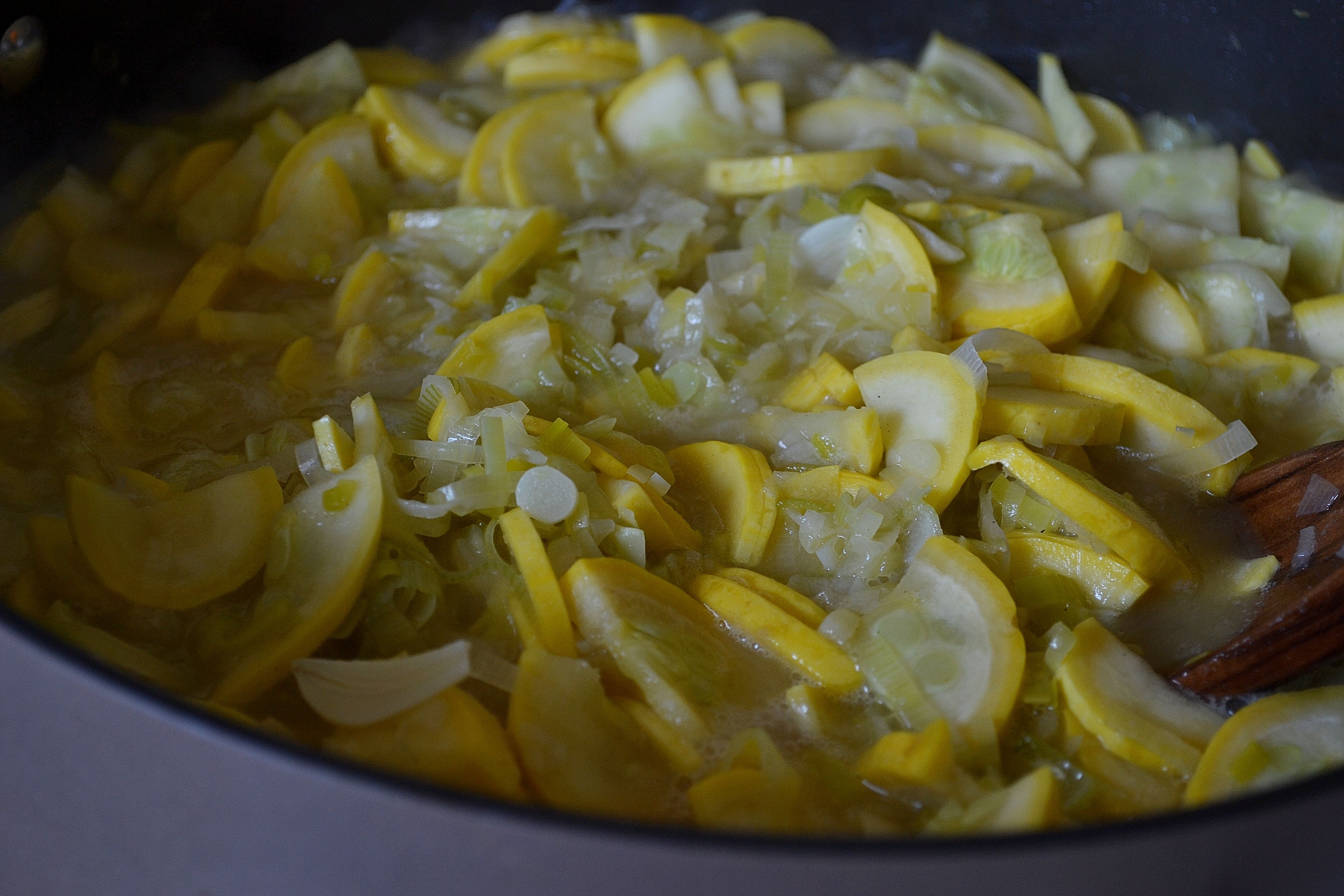 This next dish, Angel Hair Pasta with Leek-Squash Purée, will take a little more explanation than the cauliflower – let me start by saying, aside from being “Angel Hair Pasta”, this dish was an attempt to create a vegan pasta that even meatlovers could enjoy. I didn’t want the basic tomato sauce, and tossing the pasta with roasted vegetables also felt uninspiring. Walking through the aisle at my local co-op, I noticed all of the beautiful summer produce. It was then I happened on a thought: pureed vegetables…plus pasta…can it work? The answer is undeniably YES!