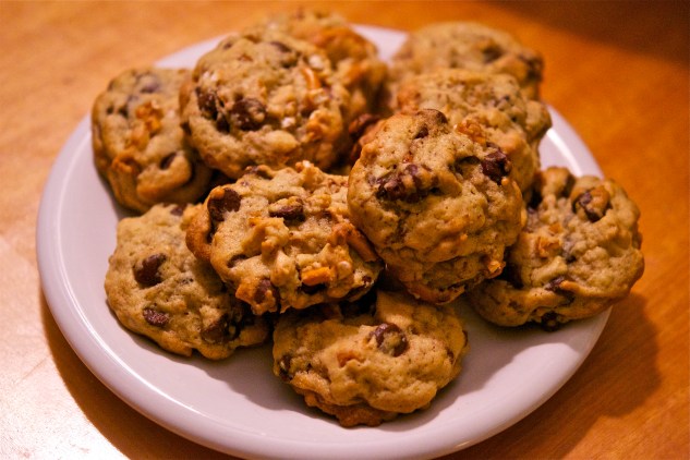 Add the flour mixture and beat just until there are no more streaks of flour. Gently stir in the chocolate chips and pretzels. Cover and refrigerate for an hour. Preheat the oven to 350F. Line baking sheets with parchment paper. Scoop out well rounded tablespoonfuls of the dough, leaving about 2 inches between each ball. Bake for 10 minutes. If you prefer crispier cookies increase the baking time by 1-2 minutes. Allow the cookies to cool on the baking sheet for a few minutes before removing.