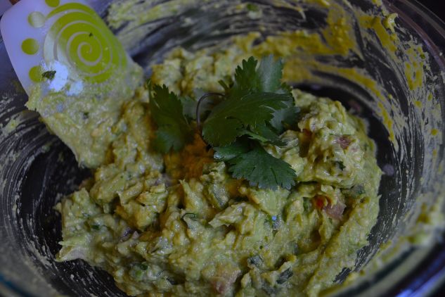 Cut avocado in large chunks and mash coarsely in large bowl with a fork. Add remaining ingredients and blend gently; leaving some small chunks is fine. Taste and adjust seasoning with more pepper sauce, salt and pepper if desired.