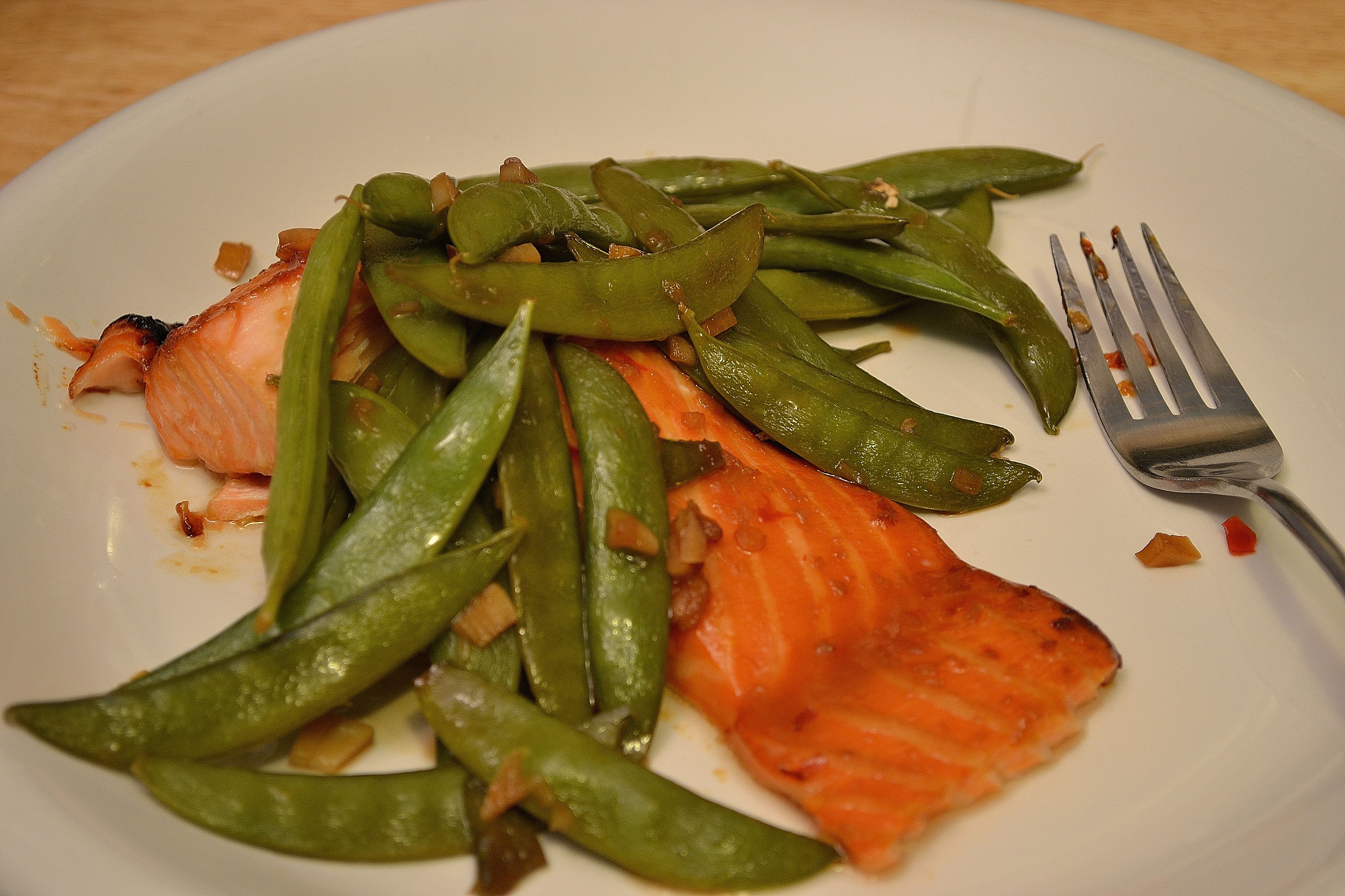 SALMON with SWEET CHILI GLAZE and SUGAR SNAP PEAS