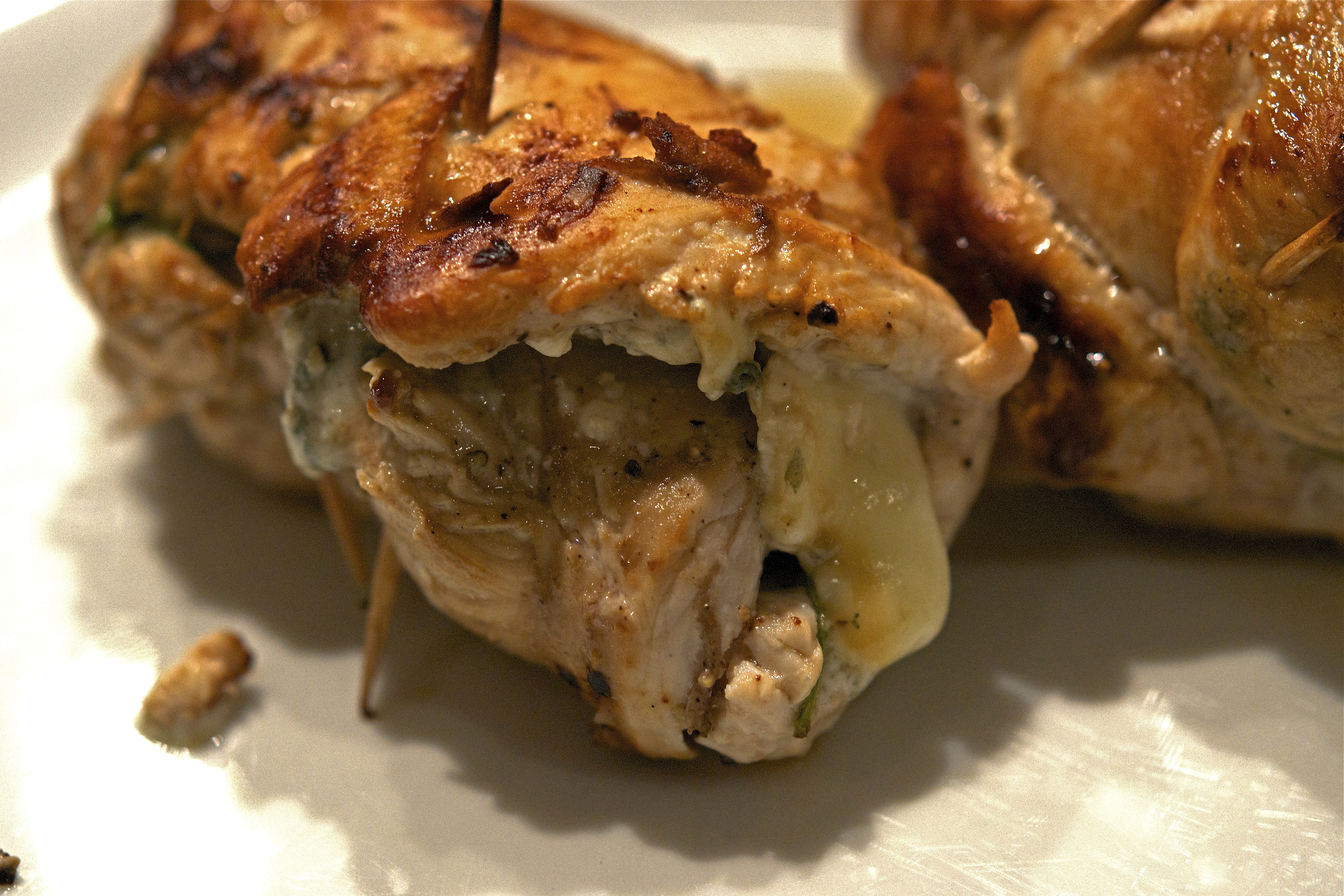Cook the chicken: Preheat your oven to 375 degrees. Heat an ovenproof pan over medium heat – cook the roulades until browned on all sides (may need to do this in batches depending on how large/small your pan is). Once browned, return all of the chicken to the pan and set in the oven for about 40 minutes (may take more or less time – thighs should be cooked-through fully). Remove from the oven and serve immediately.
