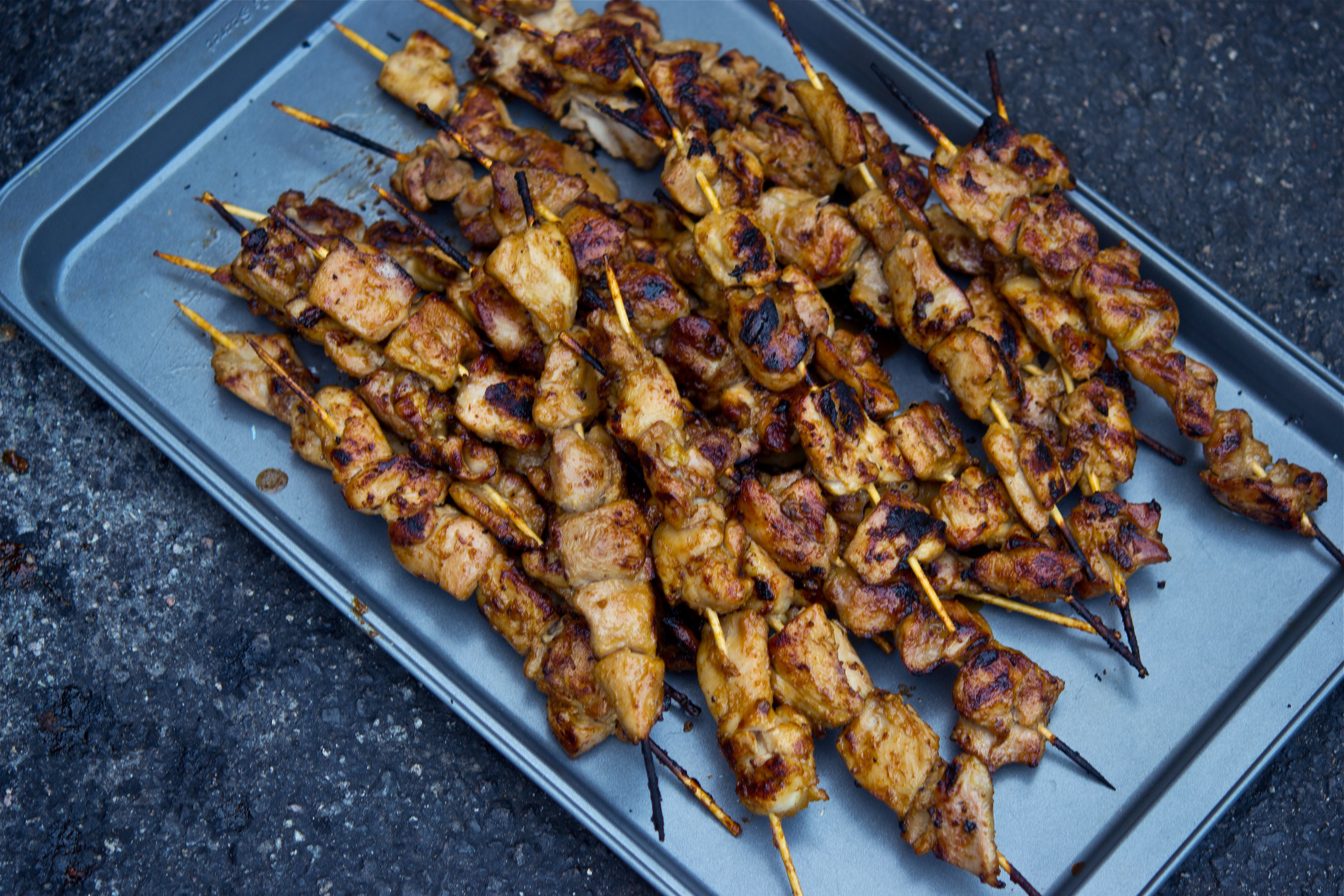 Set up a grill for direct cooking around 400F. Thread chicken onto skewers, and grill chicken for 4 to 6 minutes per side. Enjoy!