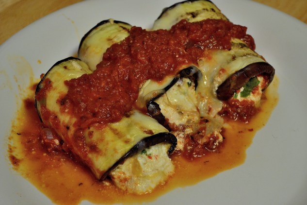 For assembly: brush eggplant slices with oil; heat grill or grill pan to medium-high heat. Grill slices until cooked through, about 3 minutes per side – allow to cool slightly. Place 2 tbsp filling at one end of each slice; Roll the eggplant tightly, starting at the end with the cheese mixture working towards you (like a jelly roll).