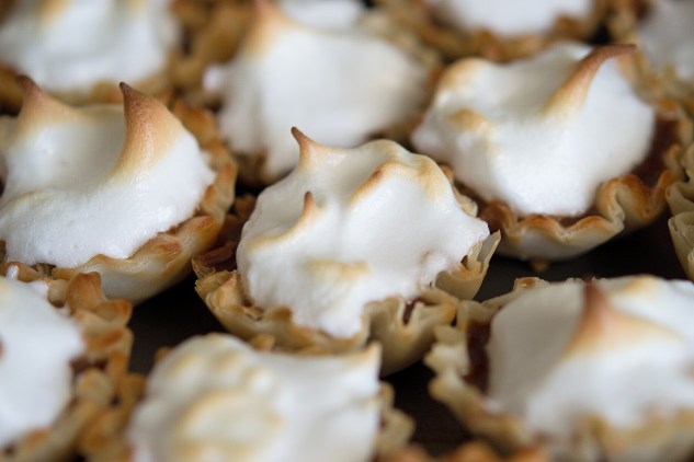 Make the meringue: beat egg whites until soft peak forms, and then slowly sugar. Continue to beat the mixture until stiff peaks form. Plop desired amount on top of each pie, and bake in the oven at 425 degrees until the tops start to turn brown. Chill finished pies for at least 2 hours before serving, and up to overnight.