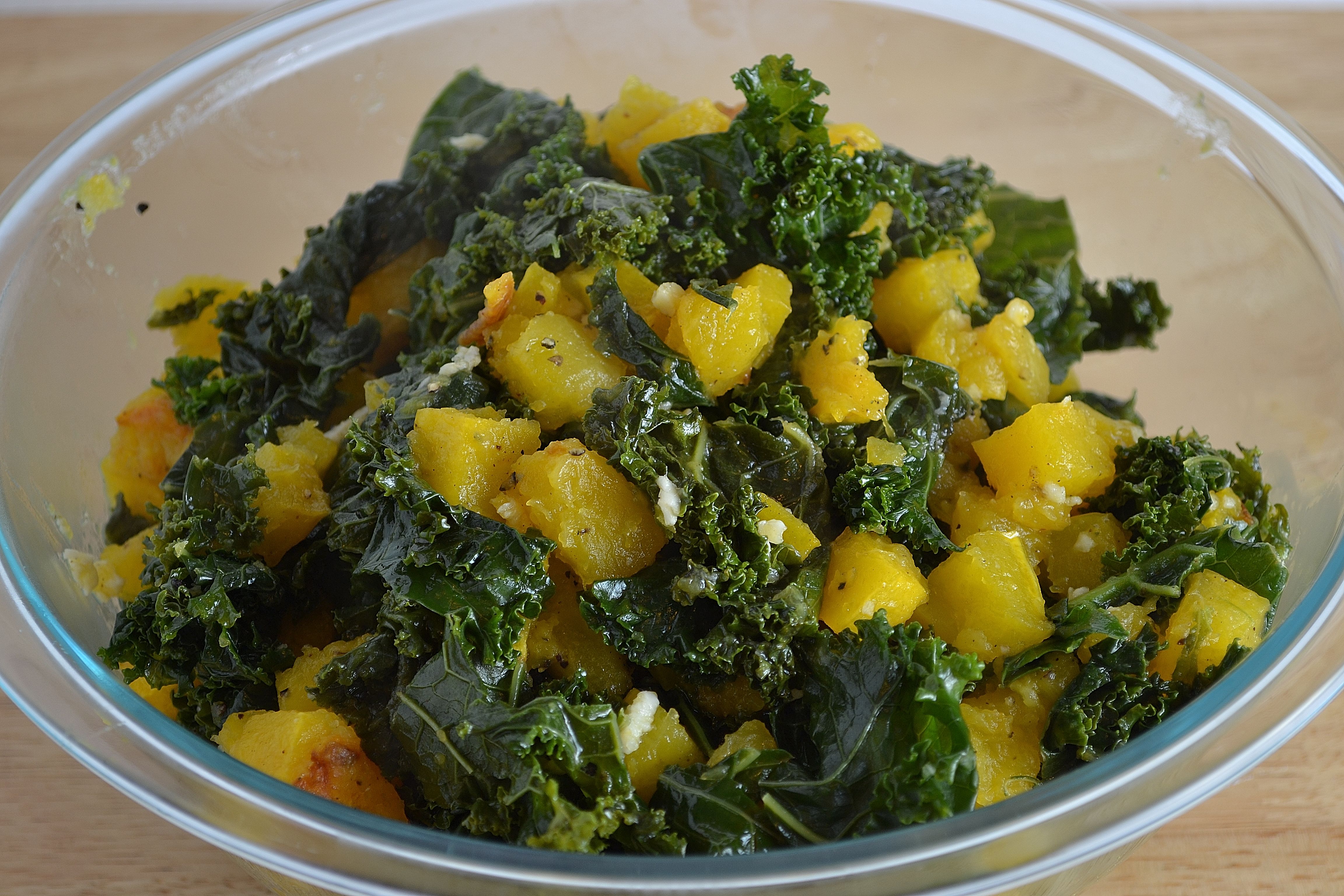 (10 minutes before removing butternut squash from oven) Tear kale leave into chunks. Heat olive oil in a large skillet over medium heat – add garlic, and cook until fragrant (about 1 minute). Add kale, salt and pepper, and stir to combine; add a splash or two of white wine, and cover – cook until the kale is steamed. Gently toss the butternut squash with the kale, and serve immediately.
