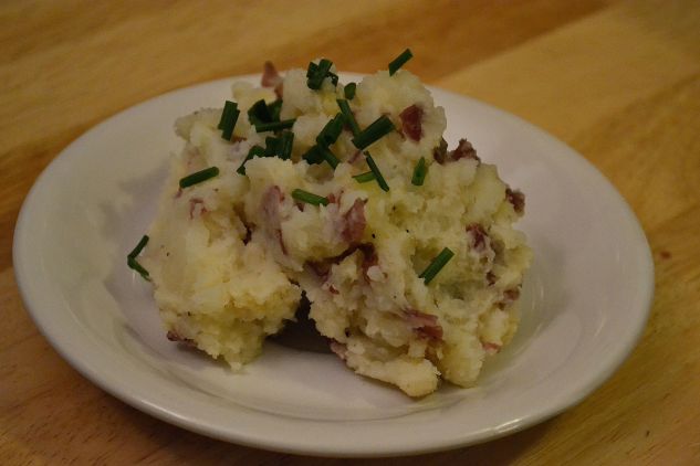 Meanwhile, place the potatoes in a large pot filled with cold water – bring to a boil, and cook until just tender (15 minutes or so). Drain the potatoes, and return to the pan – add the cloves, milk, butter, and salt & pepper to taste. Mash together to desired consistency; garnish with fresh chives.