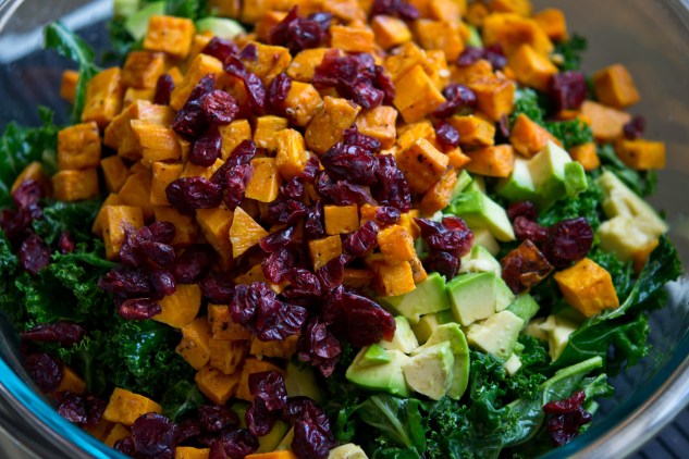 Add the sweet potatoes, avocado, and craisins to the kale, and gently toss together. Season to taste, then serve.